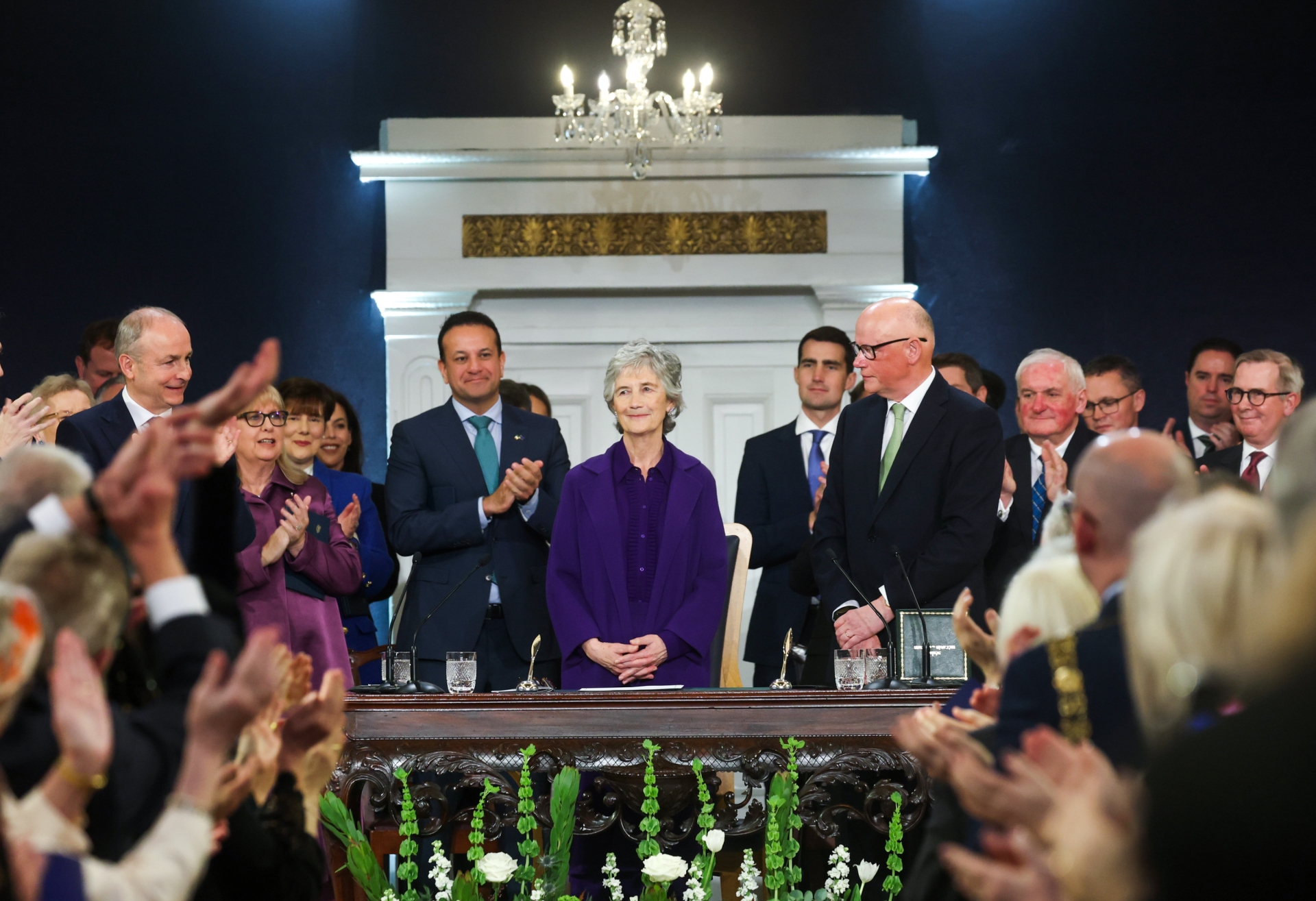 Taoiseach Micheál Martin, former presidents Mary McAleese and Mary Robinson, and outgoing president Micheal D Higgins, who received a warm round of applause as he arrived in the hall for the ceremony, were among those attending the ceremony in St Patrick’s Hall at Dublin Castle.