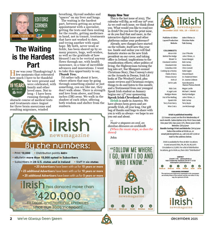 This is the last issue of 2025. The calendar will flip, as will our 19th year. As we craft each issue, we think about you. What would you like to read/see in iIrish? Do you love the print issue, or do you find that and more, in the interactive digital issue and other platforms online your preference?