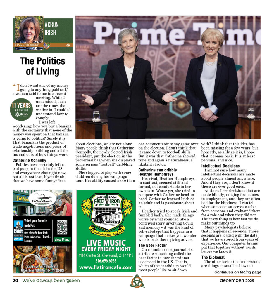 Politics have certainly left a bad pong in the air in the US and everywhere else right now, but all is not lost. If you think that we have some funny ideas about elections, we are not alone. Many people think that Catherine Connolly, the newly elected Irish president, put the election in the proverbial bag when she displayed some serious “football” dribbling skills.
