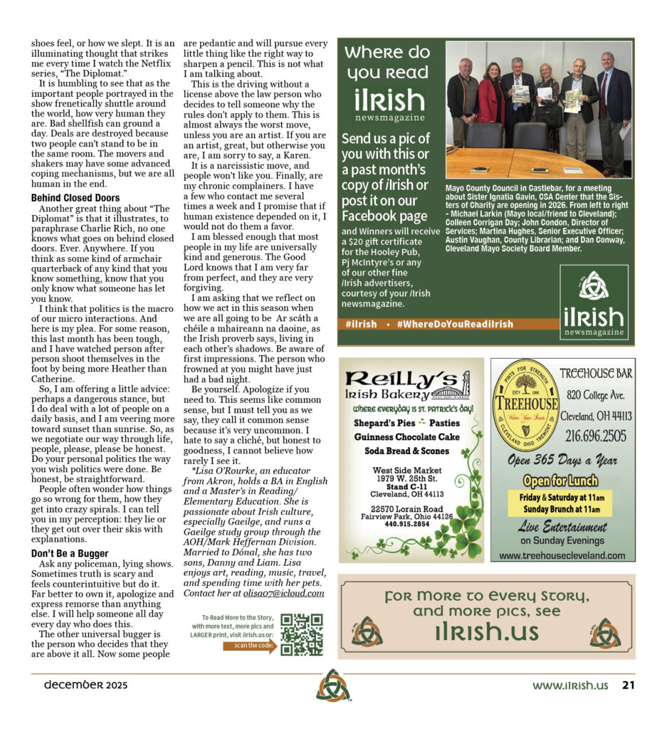 I am asking that we reflect on how we act in this season when we are all going to be Ar scáth a chéile a mhaireann na daoine, as the Irish proverb says, living in each other’s shadows. Be aware of first impressions. The person who frowned at you might have just had a bad night.