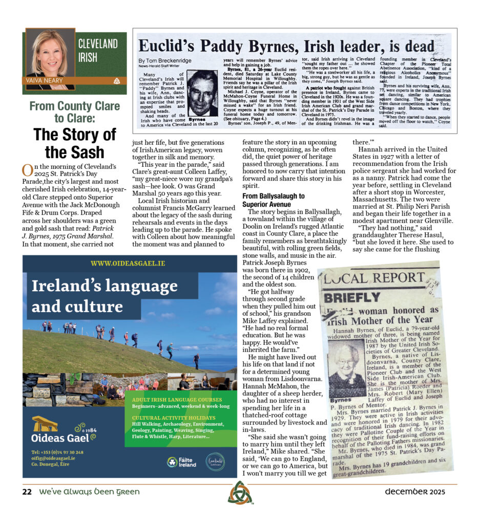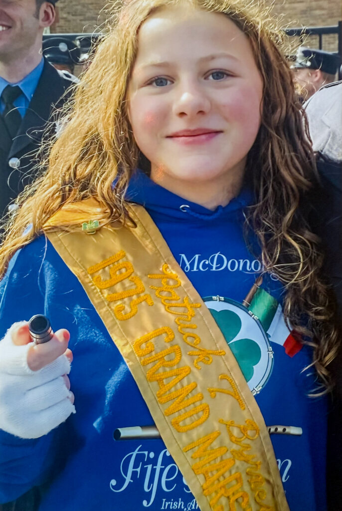 On the morning of Cleveland’s 2025 St. Patrick’s Day Parade,the city’s largest and most cherished Irish celebration, 14-year-old Clare stepped onto Superior Avenue with the Jack McDonough Fife & Drum Corps. Draped across her shoulders was a green and gold sash that read: Patrick J. Byrnes, 1975 Grand Marshal. In that moment, she carried not just her fife, but five generations of Irish American legacy, woven together in silk and memory.