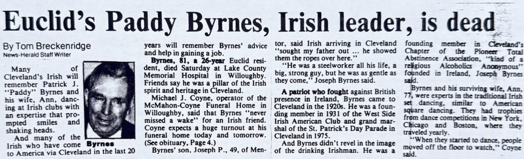 In 1975, Patrick was honored as Grand Marshal of Cleveland’s St. Patrick’s Day Parade by the United Irish Societies. “He was very tall, very dignified,” Colleen said. “When he walked down that avenue, you could see how much it meant to him — this boy from County Clare, who’d made good in America.”