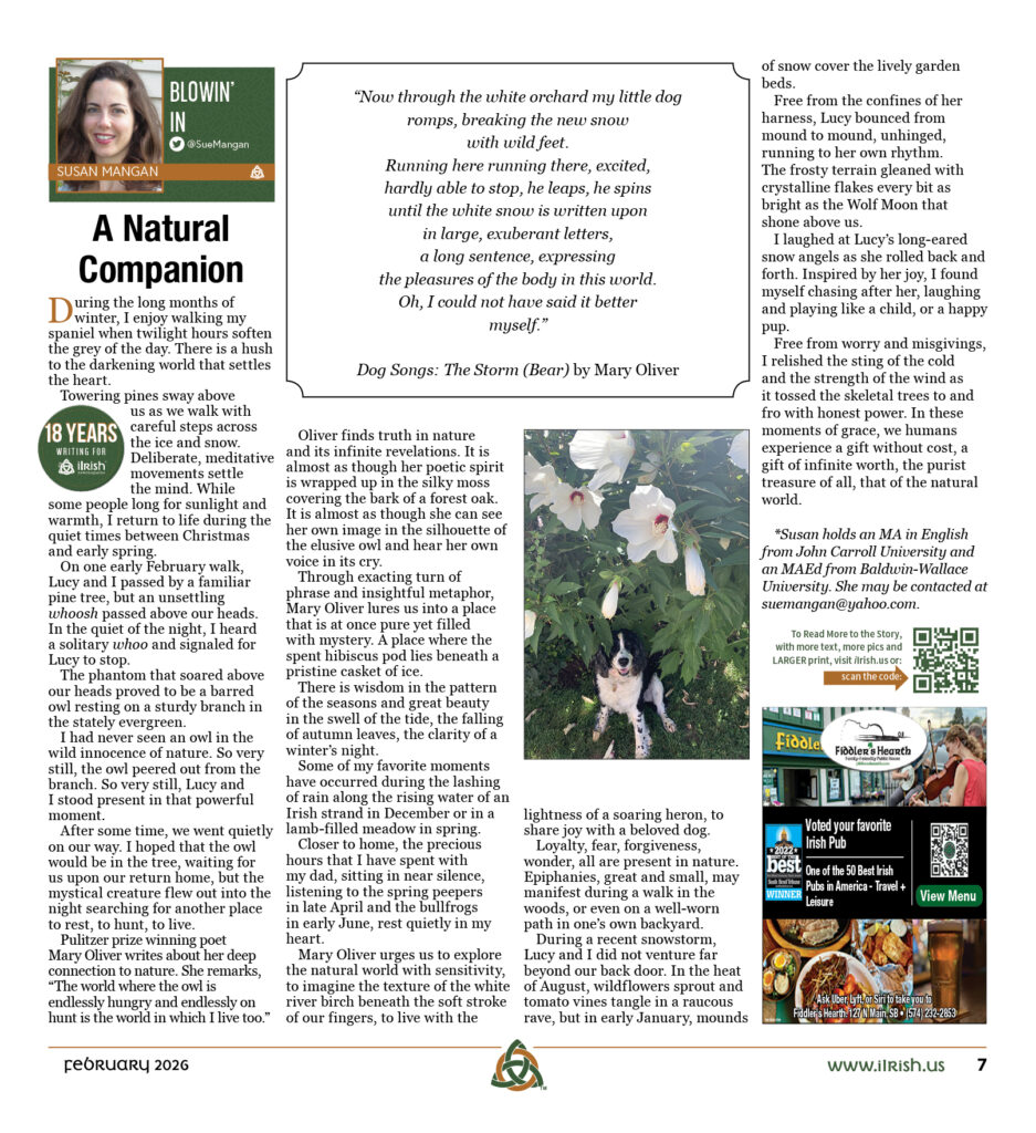 On one early February walk, Lucy and I passed by a familiar pine tree, but an unsettling whoosh passed above our heads. In the quiet of the night, I heard a solitary whoo and signaled for Lucy to stop.