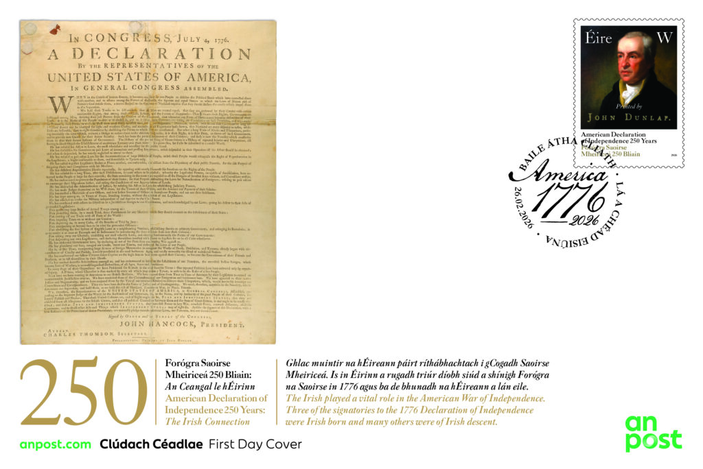 U.S. Ambassador to Ireland Ed Walsh said, “As the United States marks 250 years of independence, this commemorative stamp is a meaningful tribute to Ireland’s role in America’s founding story. John Dunlap, born in County Tyrone, printed the first copies of the Declaration of Independence in Philadelphia. Irish Americans fought for our independence, helped design and build the White House, served with distinction in our armed forces, and contributed to American public life and innovation. As we mark this milestone, we recognise the strong and lasting friendship between our nations.”
