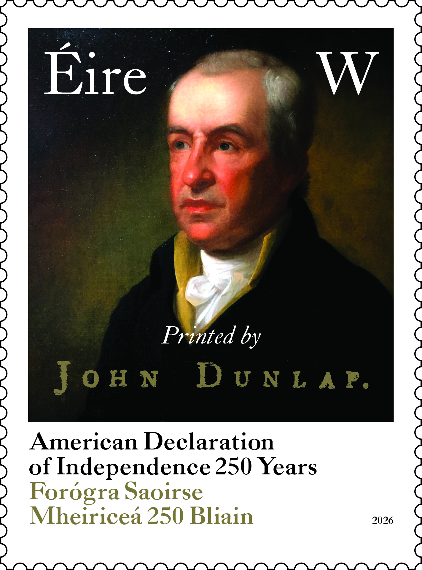 Minister for Culture, Communications and Sport, Patrick O’Donovan TD said, “This stamp is a powerful reminder of the deep and enduring ties between Ireland and the United States. John Dunlap’s story reflects the profound influence of the Irish diaspora in shaping pivotal moments in global history. The ideals expressed in the Declaration of Independence: liberty, equality and democratic self-determination – resonated far beyond America’s shores and would later find powerful expression in Ireland’s own struggle for independence. It is fitting that An Post marks this 250th anniversary by honouring an Irishman whose work helped give voice to one of the most important documents in modern history.”