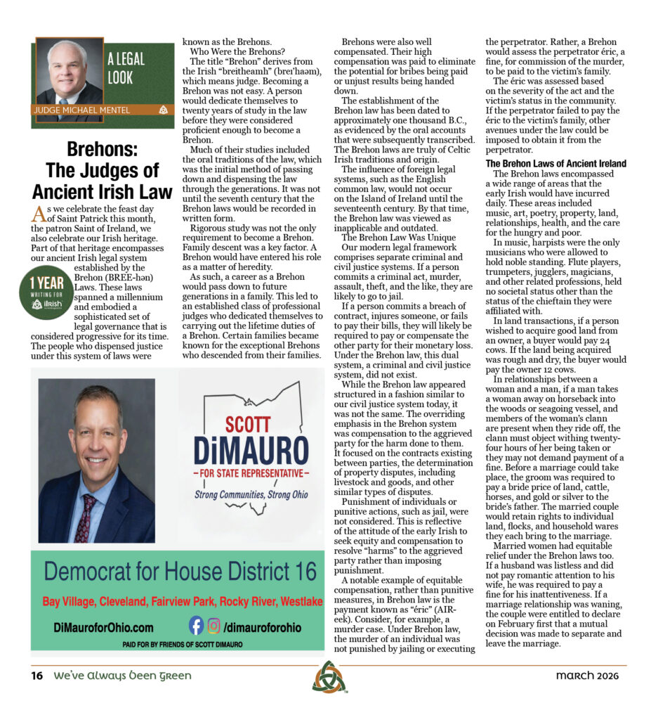 As we celebrate the feast day of Saint Patrick this month, the patron Saint of Ireland, we also celebrate our Irish heritage. Part of that heritage encompasses our ancient Irish legal system established by the Brehon (BREE-hǝn) Laws. These laws spanned a millennium and embodied a sophisticated set of legal governance that is considered progressive for its time. The people who dispensed justice under this system of laws were known as the Brehons.