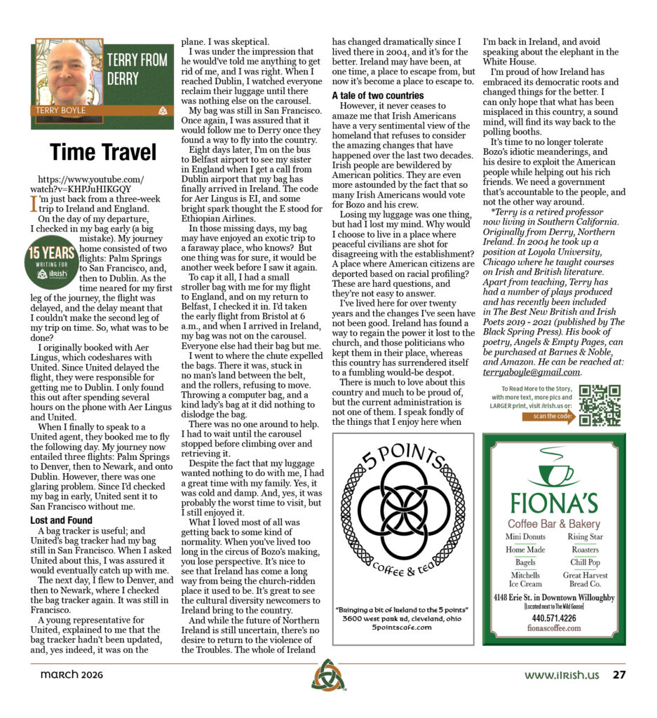 My bag was still in San Francisco. Once again, I was assured that it would follow me to Derry once they found a way to fly into the country.