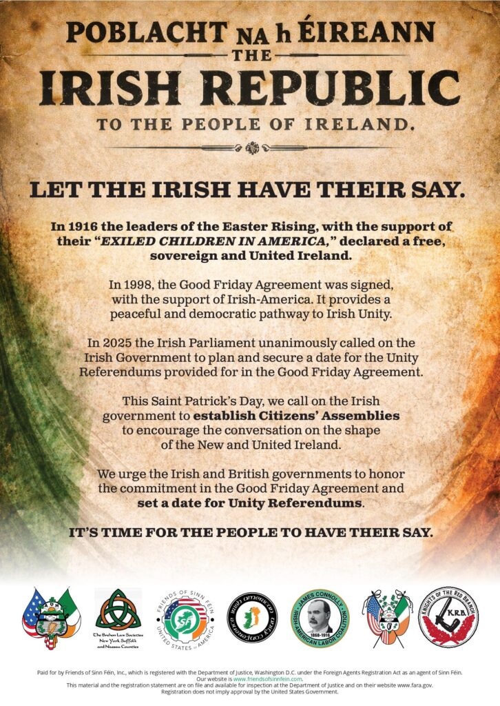 Where there is Irish history, there is also hope, a desire for the best for our island and our people. It crosses social class, geography, and politics. Today, it is finding voice in rising support for Irish Unity. The recognition that Irish America can and will play a role in ending the division of our Island and uniting the people. This generation can fulfill the dream of all those who left our shores and build a nation in which immigration is a choice and not a necessity, and where the path back home is clear.