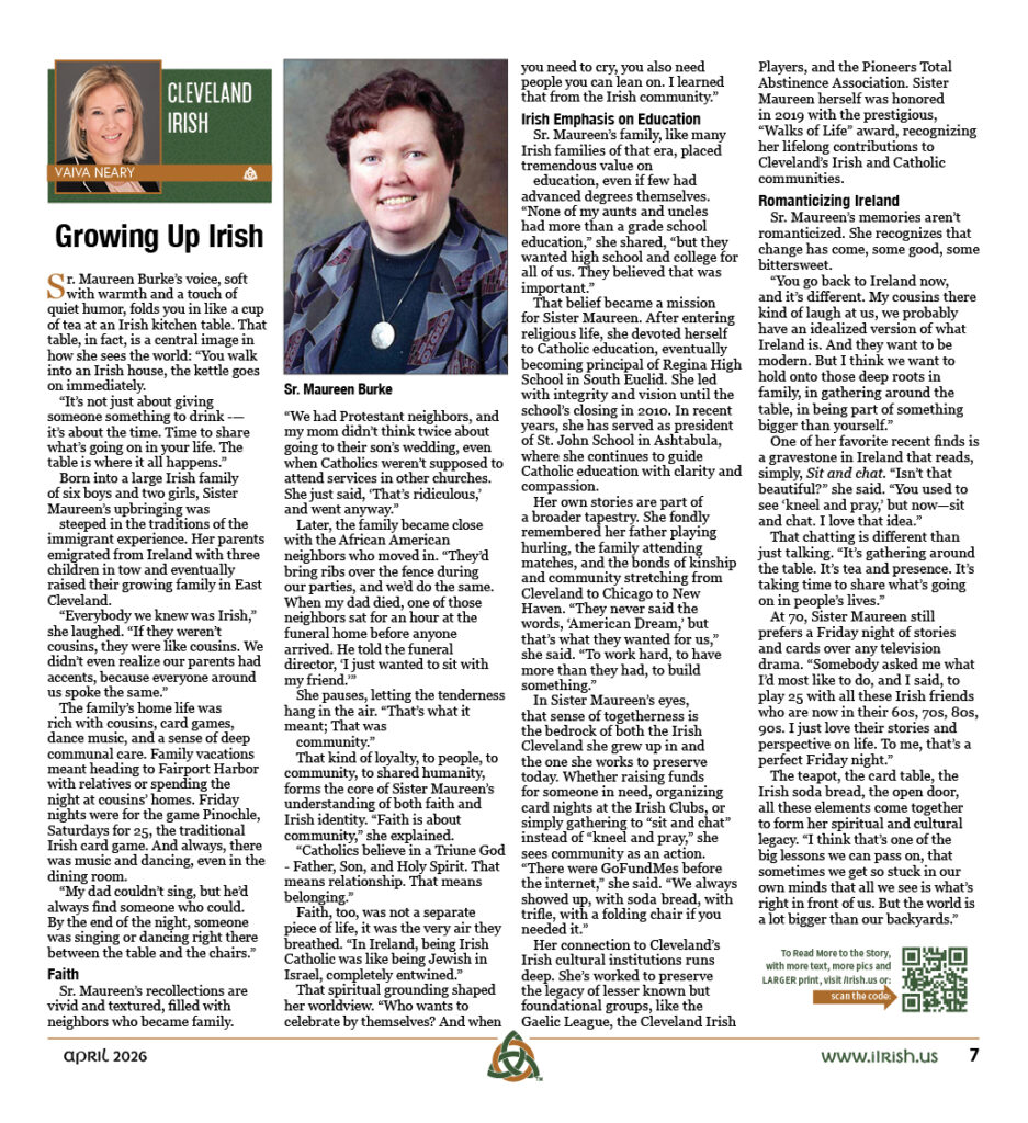 In Sister Maureen’s eyes, that sense of togetherness is the bedrock of both the Irish Cleveland she grew up in and the one she works to preserve today. Whether raising funds for someone in need, organizing card nights at the Irish Clubs, or simply gathering to “sit and chat” instead of “kneel and pray,” she sees community as an action. “There were GoFundMes before the internet,” she said. “We always showed up, with soda bread, with trifle, with a folding chair if you needed it.”